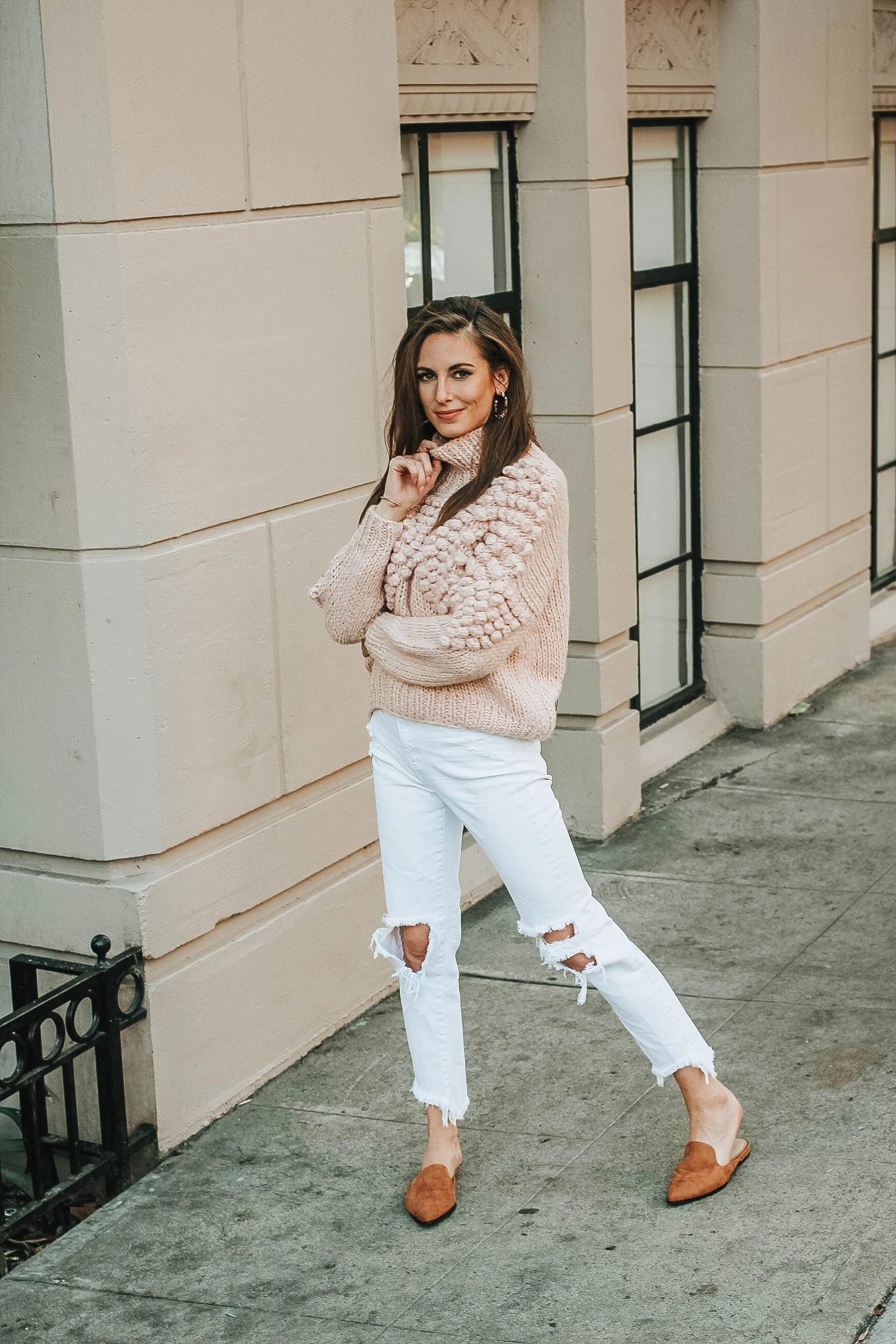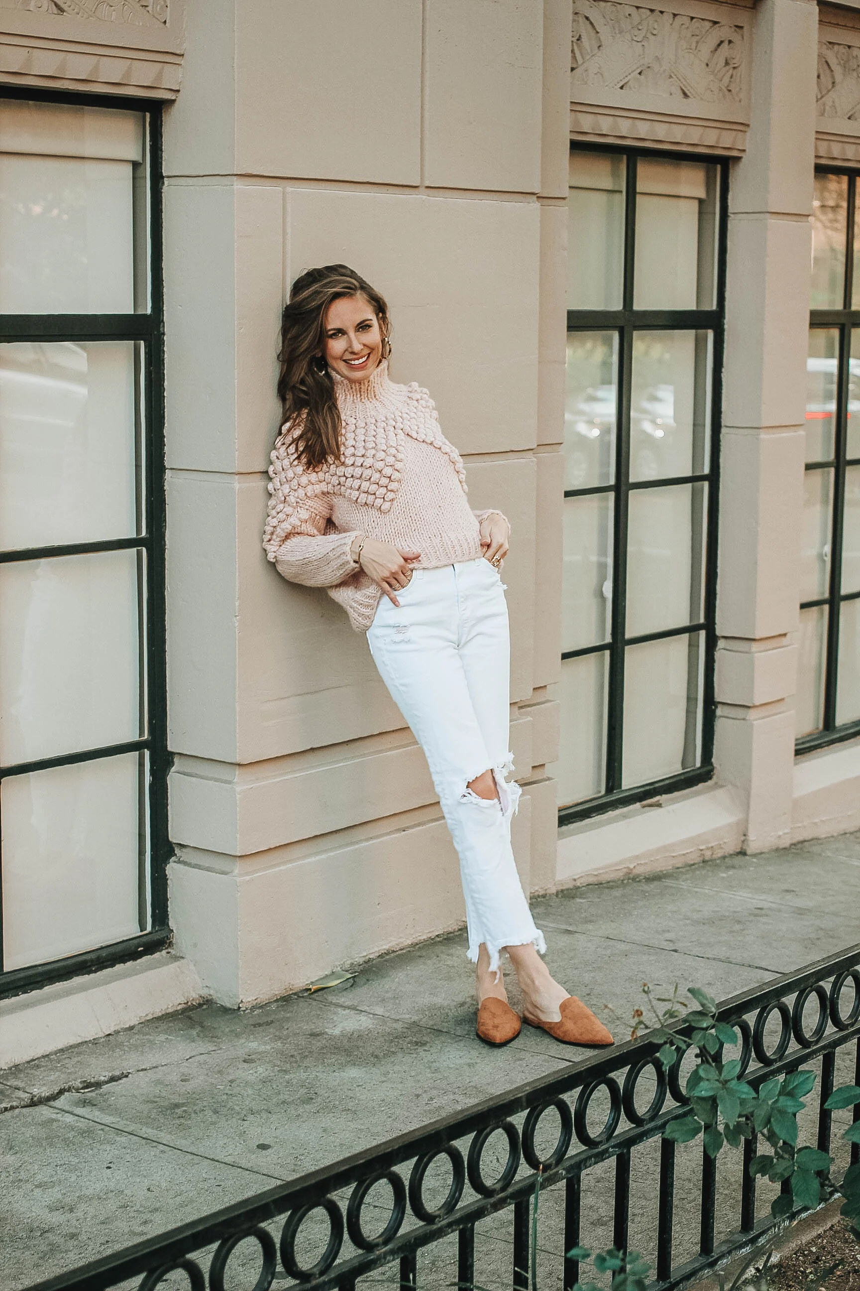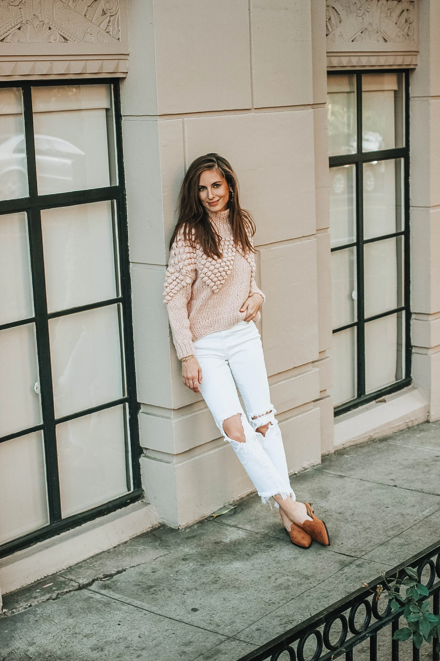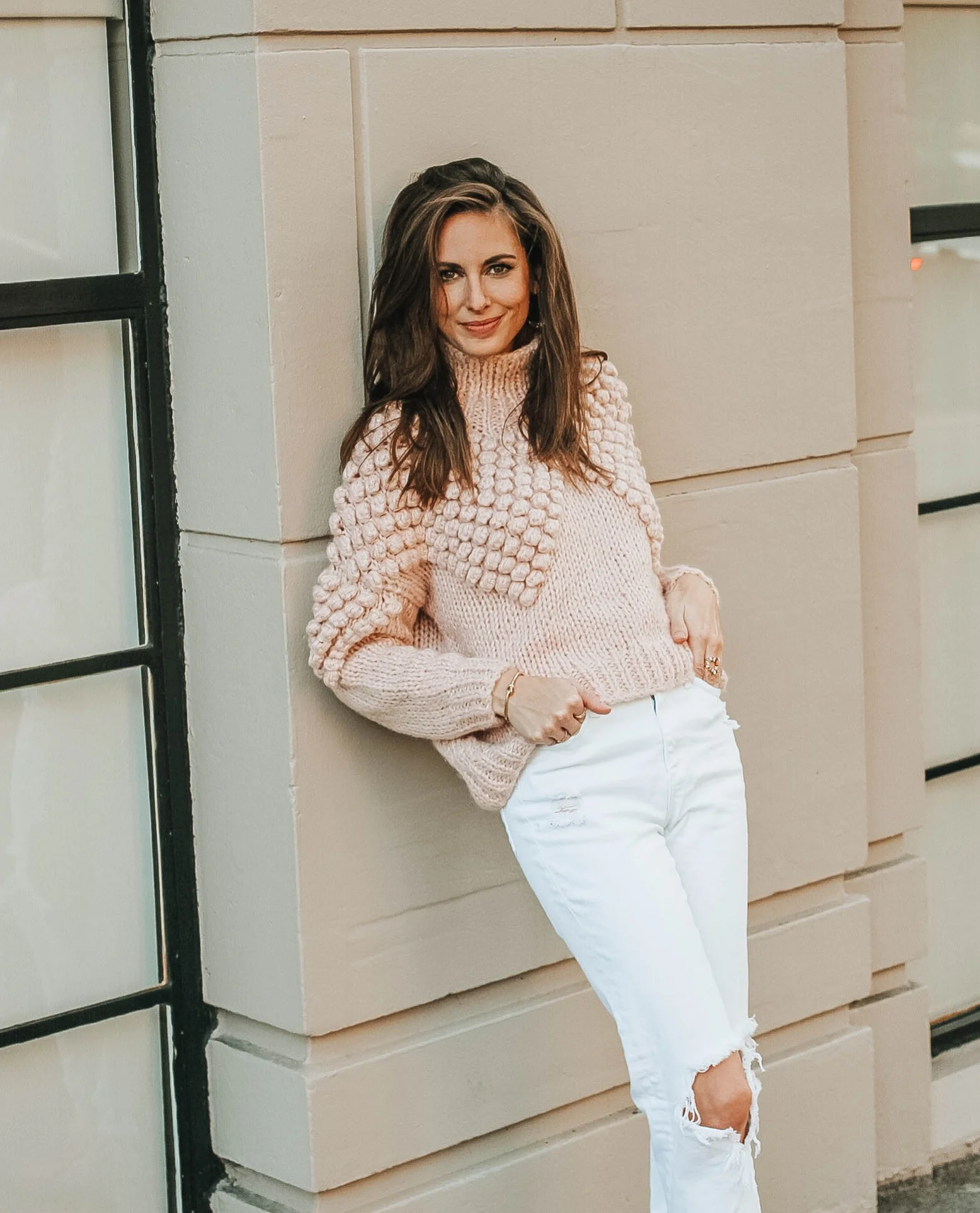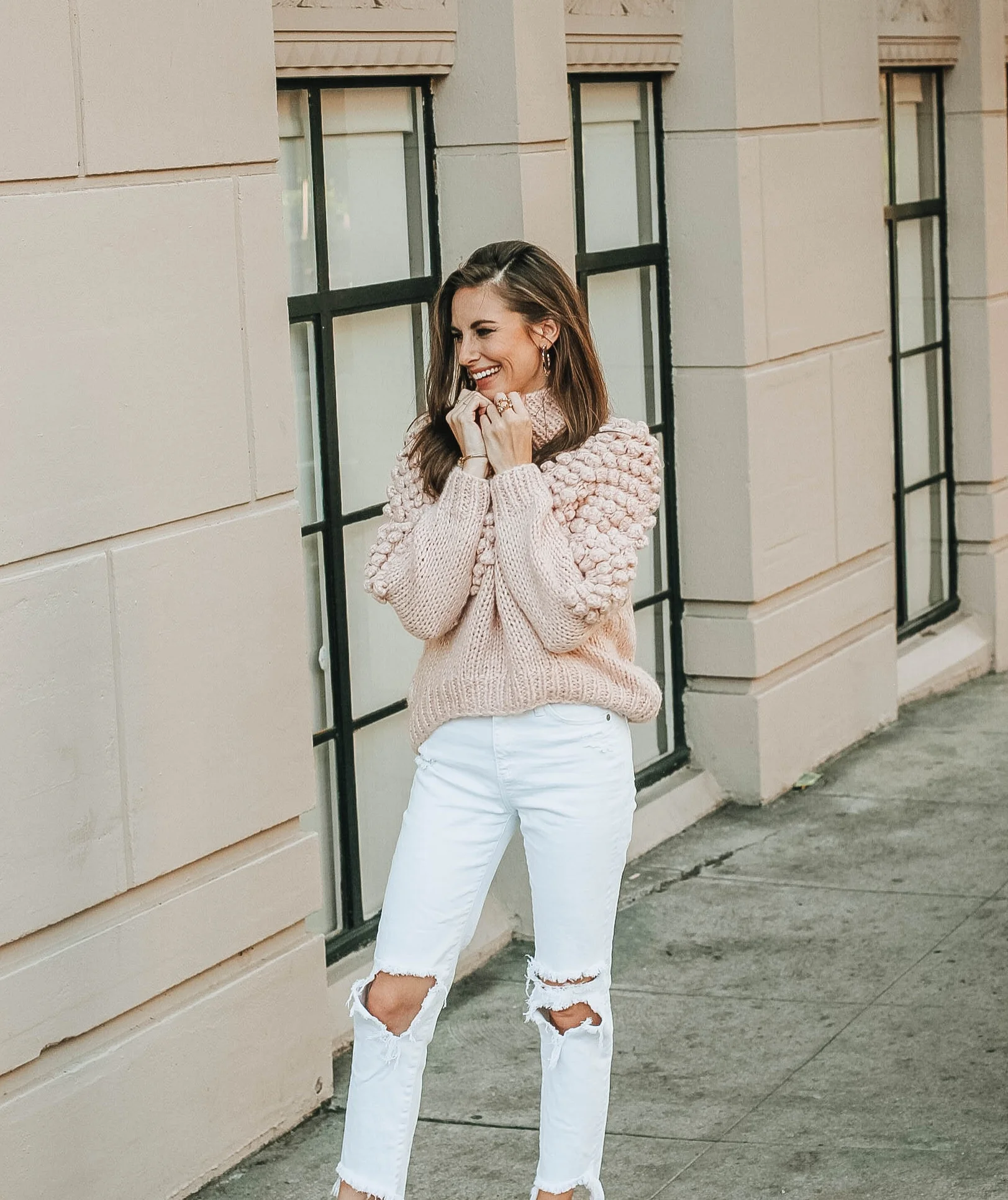 Winter weather got you dressing in gloomy grey and brown colors? I get it. But the easiest way to brighten up your current wardrobe is to add a pop of pink or yes, even white. From blush jackets to cream-colored boots, lighter colors (typically reserved for summer) will give your closet a refreshing boost this season. This cozy pompom sweater from Chicwish is the perfect place to start. Not only does it keep you warmer than a fireplace, but it adds a bit of new visual appeal to your basic cold weather lineup.