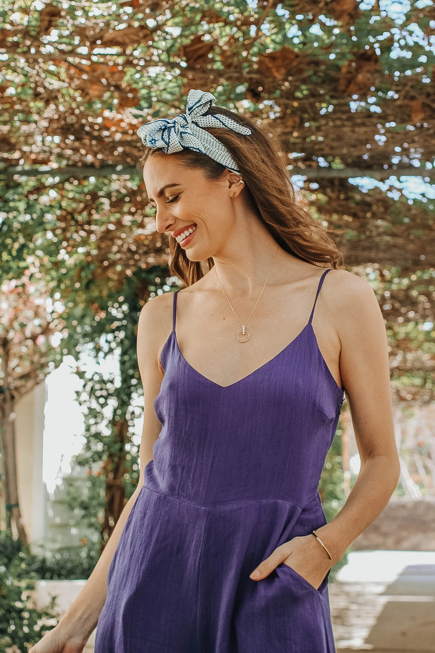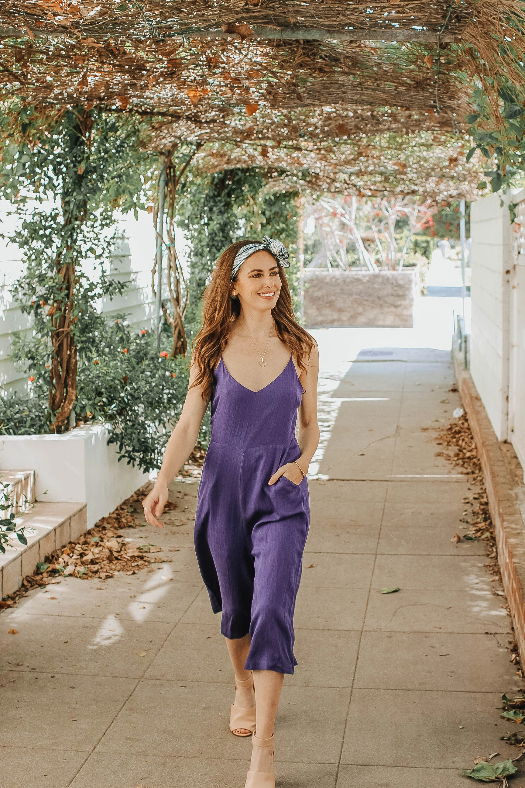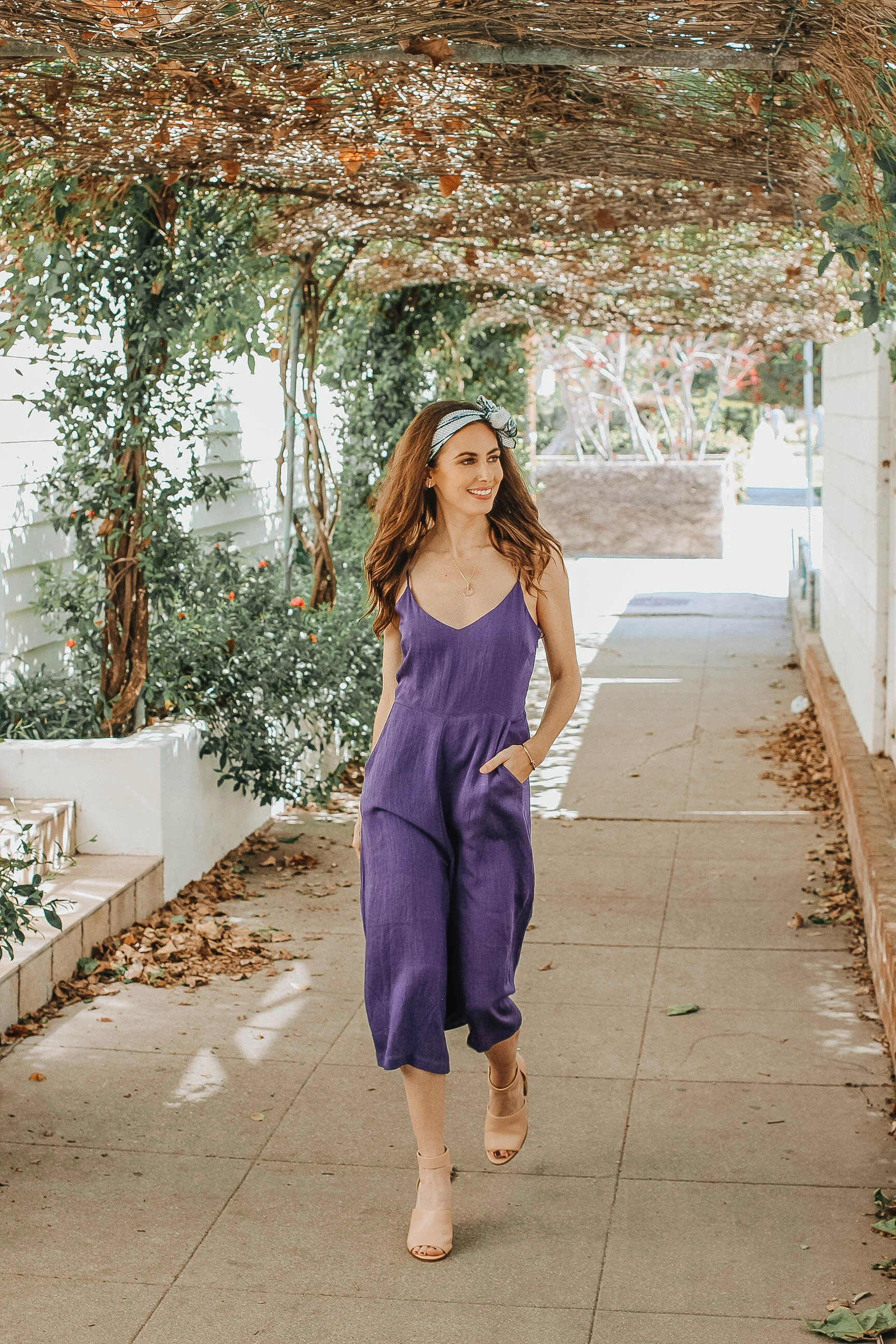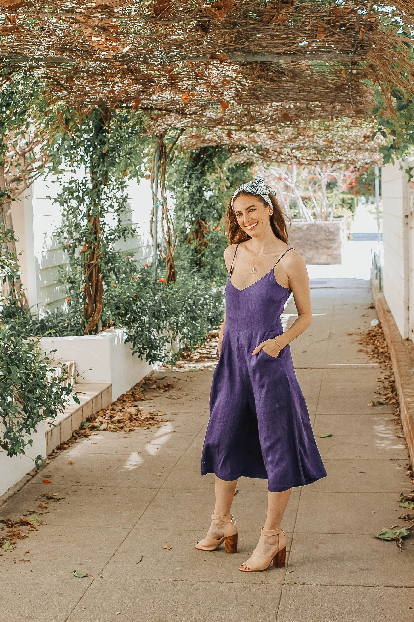 Alas, this Morning Lavender jumpsuit proves that cozy and chic can be done! Paired with nude sandals, it's a throw-on-and-go type of outfit that works for day or night. Paired here with simple jewelry from my new Aurate curated jewelry box and a hair scarf, it's perfect the perfect look for an afternoon date.