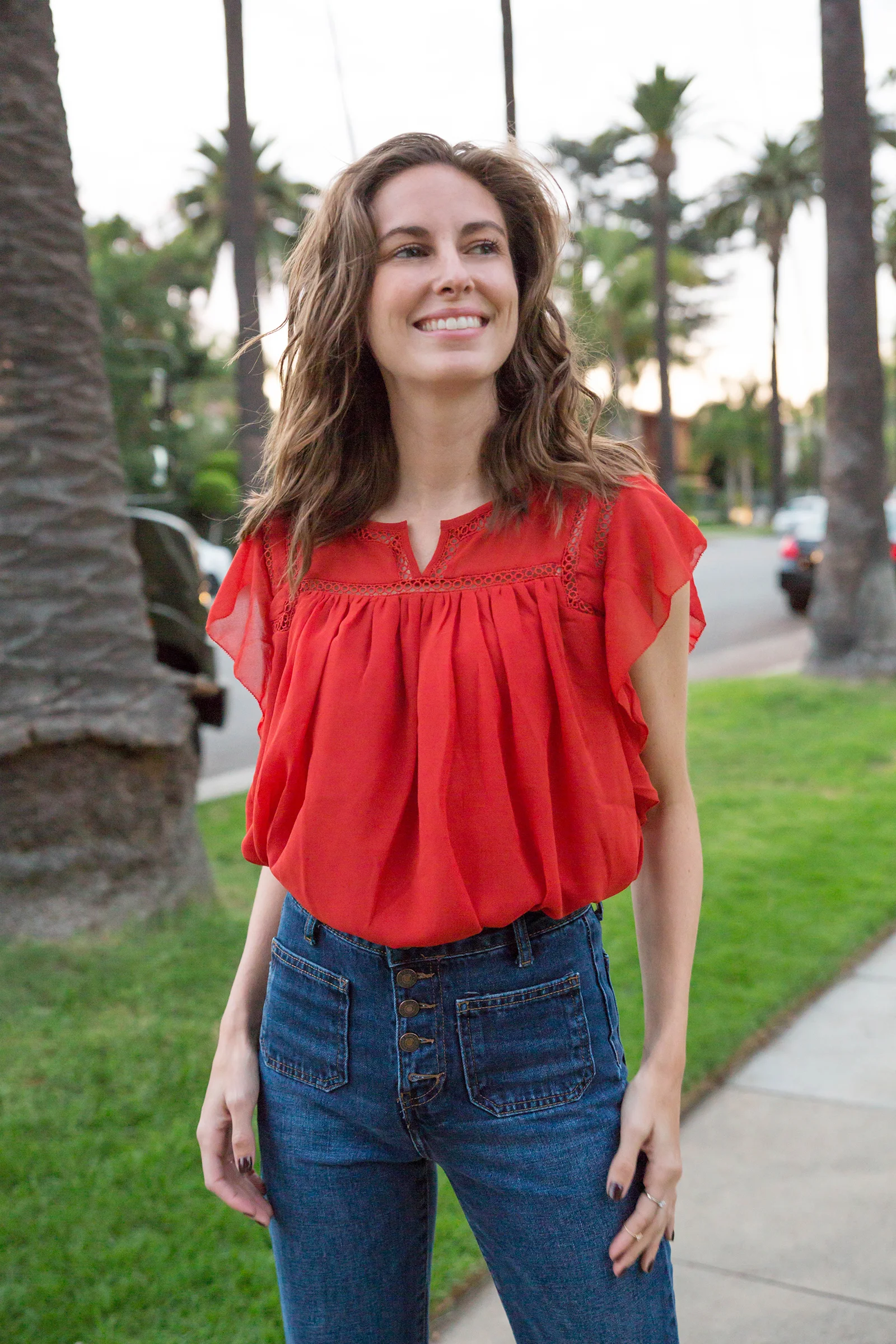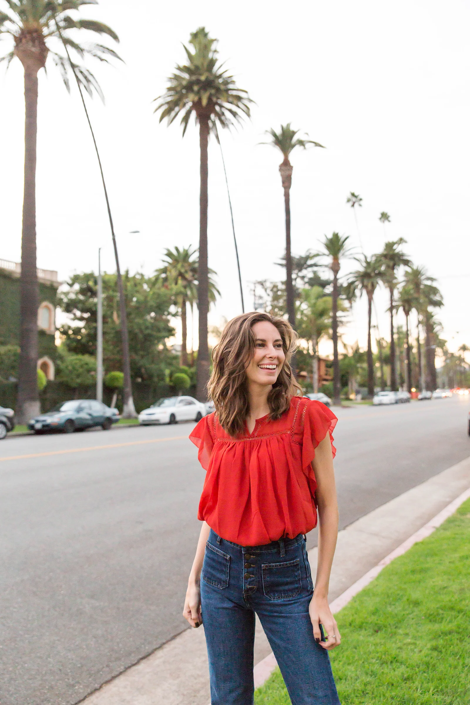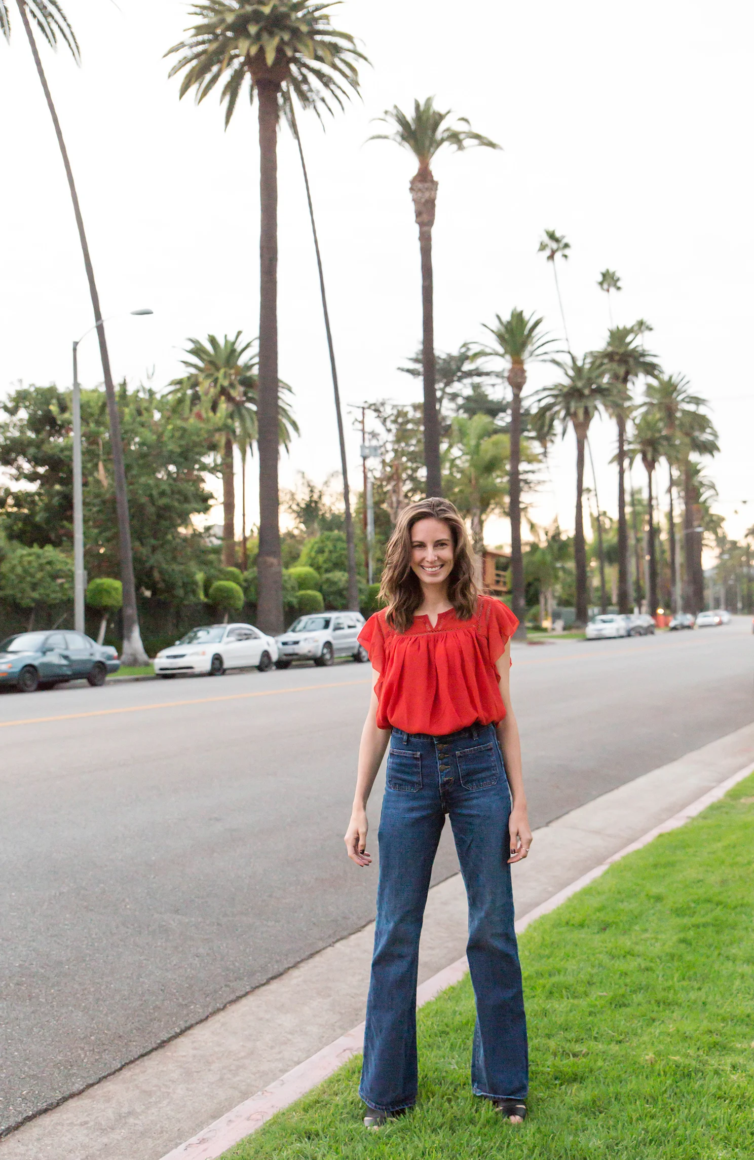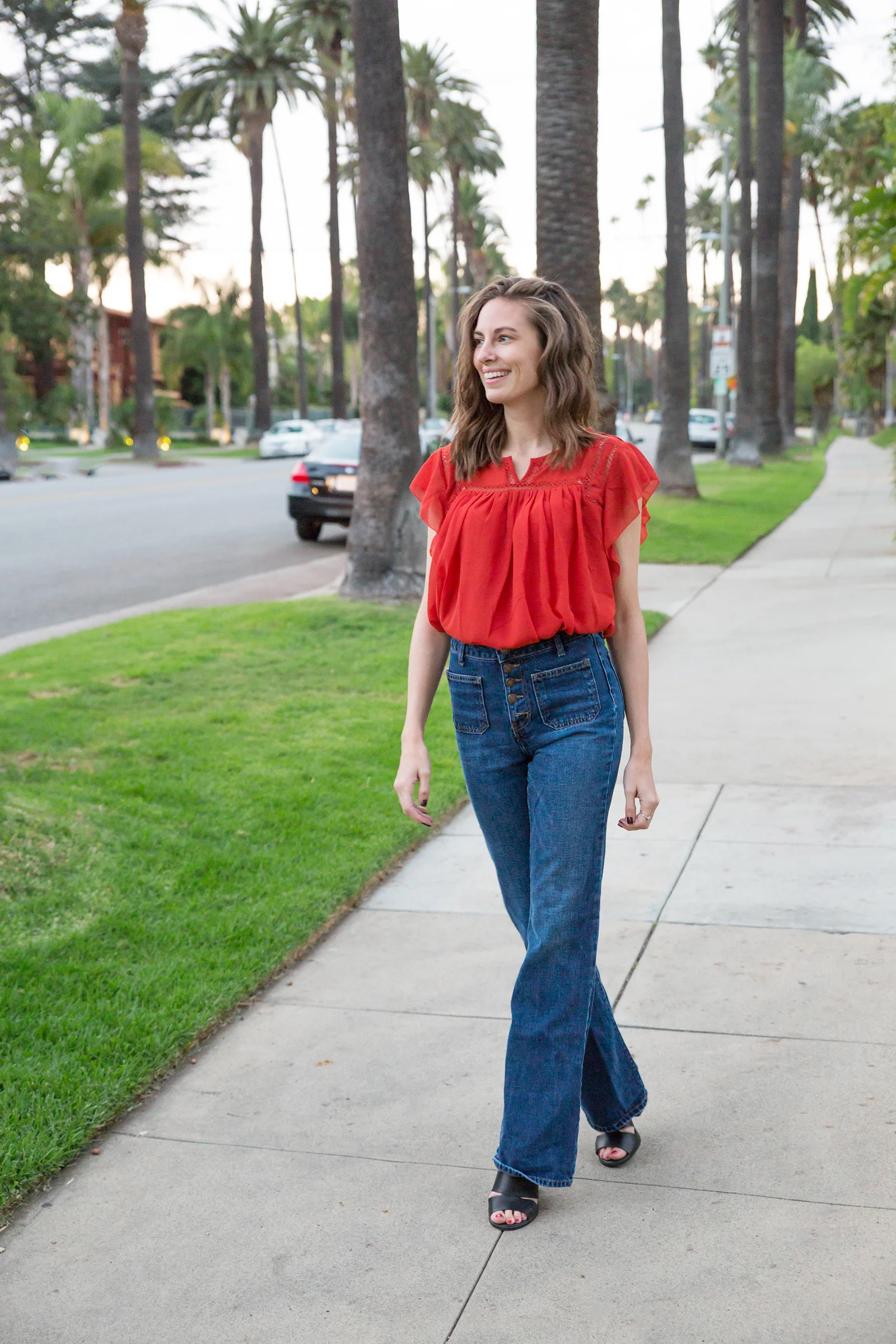 For these months that are cool but not cold, and warm but not steamy, I look to transitional pieces. You really can't go wrong with a pair of flared jeans. Yup, the seventies-inspired bell-bottomed variety. You may remember these from a post I did back in March but they are truly season-less. I recommend finding a pair with a high-waisted silhouette because it helps to create that curvy waist, long-legged look that we all love. Oh and what's not to love about this top? I found it on the sale rack at The Loft a few weeks ago and it’s the perfect year-round staple. Great with ripped jeans, a moto jacket, a midi skirt or in my case today, flared pants—this flirty little top is always a great choice. What are some of your always-in-season pieces?